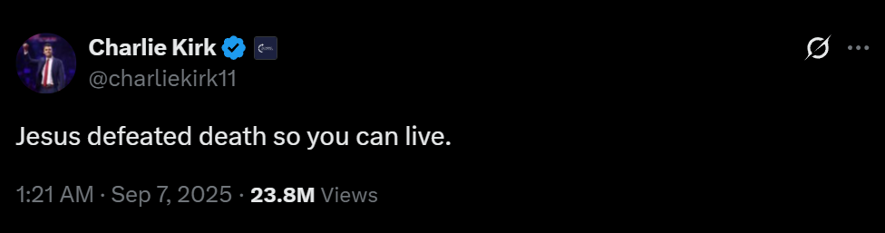 Na početku sam istaknuo da je Charlie Kirk bio kršćanin i, po svjedočanstvima mnogih, nastojao je vjerno nasljedovati Krista. Charlie je vjerovao da je Isus umro na križu i uskrsnuo i time nam darovao istinski život. Upravo je tu vjeru izrazio nekoliko dana prije svoje smrti na X-u: „Isus je pobijedio smrt da bi ti mogao živjeti.“ Neka Gospodin milostiv bude Charlieju i utjeha njegovoj obitelji, neka mu oprosti svaki njegov grijeh i daruje mu mjesto osvježenja, svjetlosti i mira. I nemojmo zaboraviti Charliejeve riječi: „Kada ljudi prestanu razgovarati, događa se nasilje.“ Odbacimo stoga sablast bezličnosti što vlada društvenim mrežama i odimo na pivo, gdje ćemo se sa svojim neistomišljenicima susresti licem u lice i razgovarati.